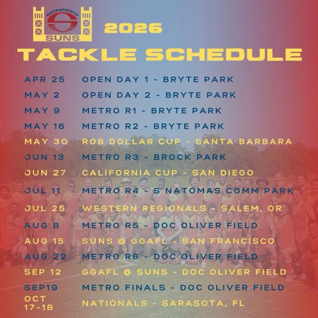 This is Sacramento’s local Australian Football league (both a mens and womxns game each week) with matches hosted throughout the summer. Players are divided onto one of four pods and each week two pods combine to form a team. There are typically six rounds where all four pods will have the opportunity to play and pair up twice. The finale will be a day of draft, with the two highest ranked pods selecting players from the remaining pool for the final game! Metro players often play at the next level as a Sun for our competitive USAFL travel teams.