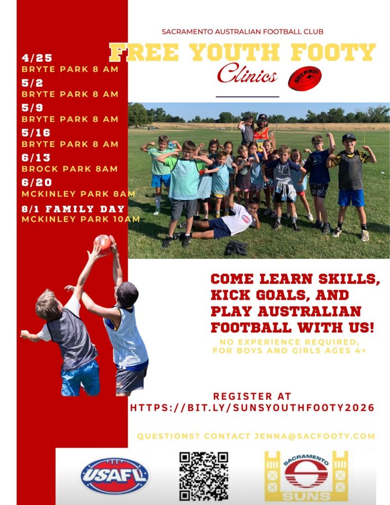 The Sacramento Australian Football Club will be hosting a series of FREE youth clinics for kids & teens who would like to come learn how to play Australian Rules Football–also known as Aussie Rules Football or “Footy”.